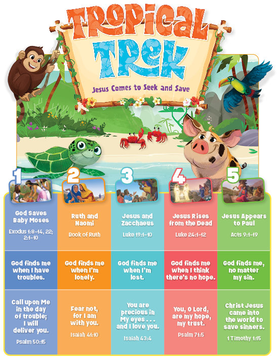At Tropical Trek VBS, five Bible stories will show kids that God is always there for them, finding them when they’re having troubles, feeling lonely, lost, hopeless, or not good enough. In fact, God the Father loves us so much that He sent His Son, Jesus, to save us. Because Jesus died and rose to life, we have hope and new life in Him!
